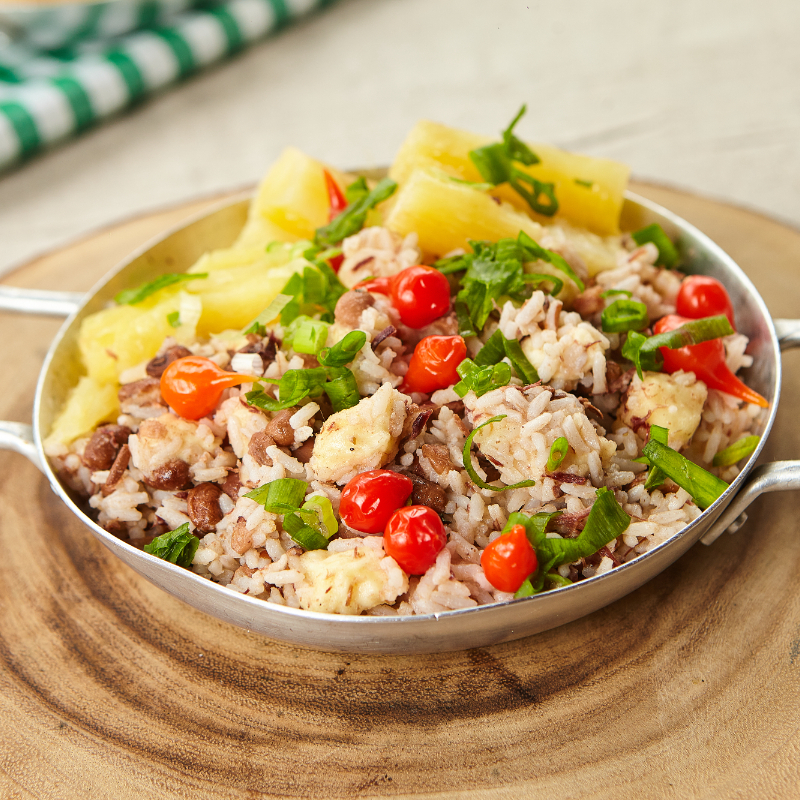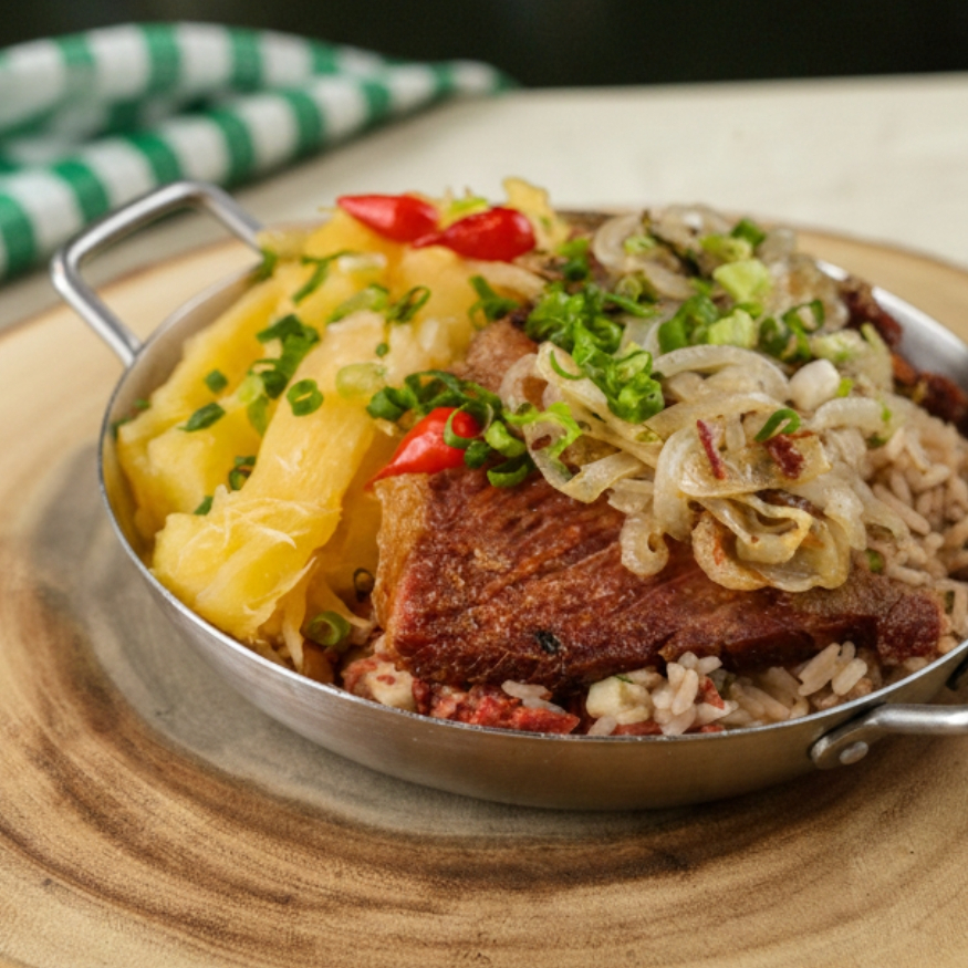 Baião de Dois preparado com arroz, feijão de corda, calabresa, carne seca desfiada, queijo coalho e mandioca cremosa., cozida na manteiga.