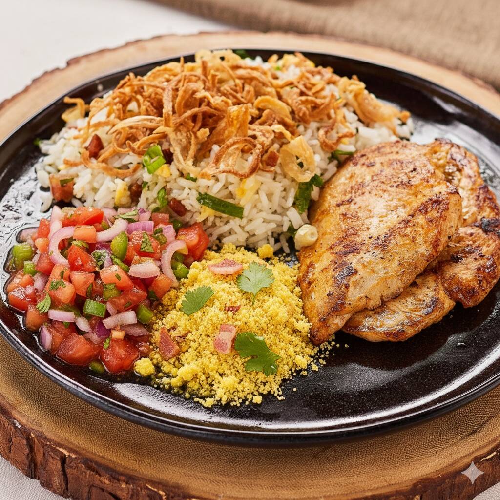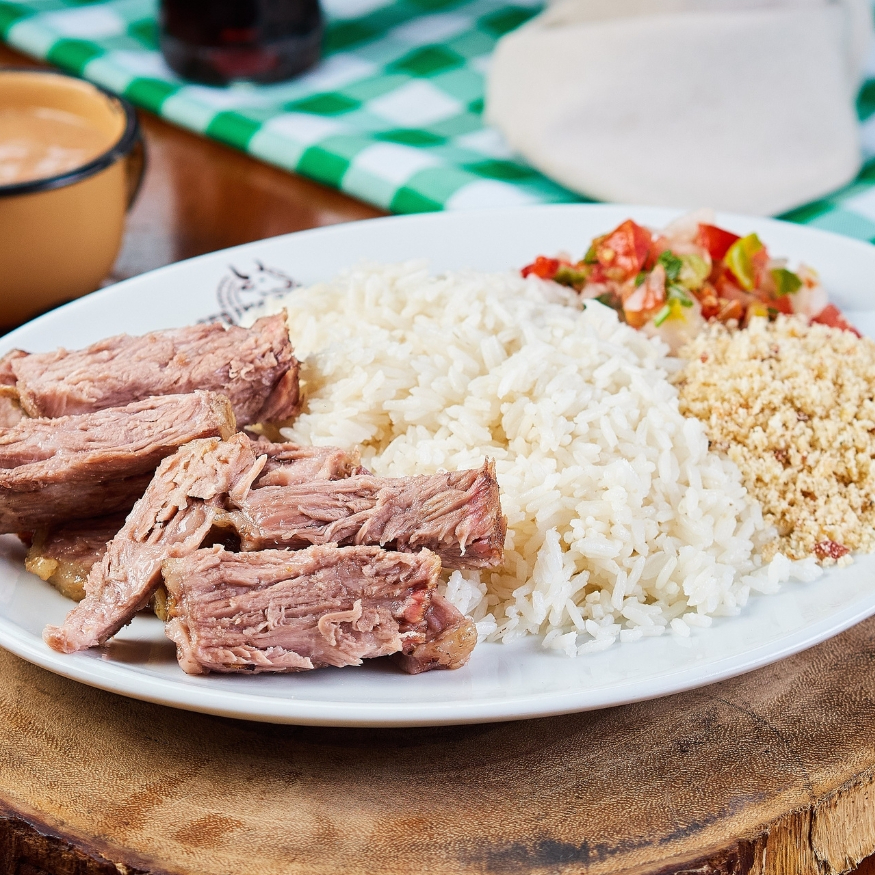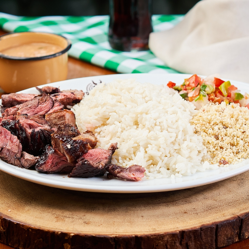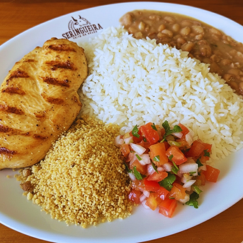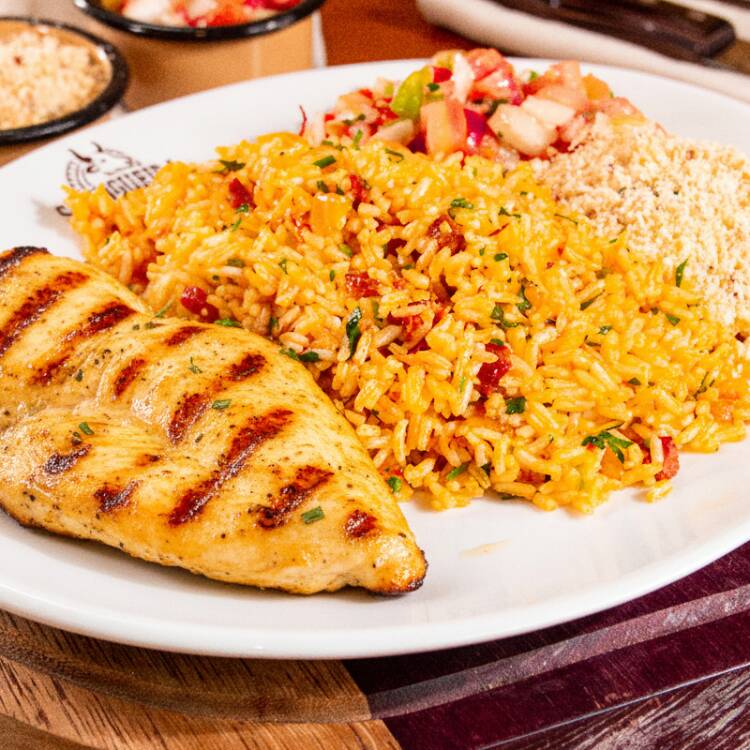 Filé de Frango, servido com arroz preparada com tomates, calabresa, carne seca desfiada, salsinha. Acompanha vinagrete e farofa.