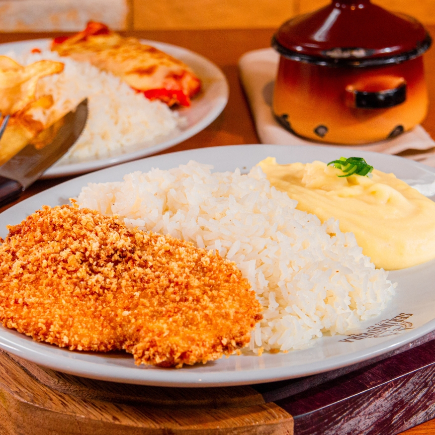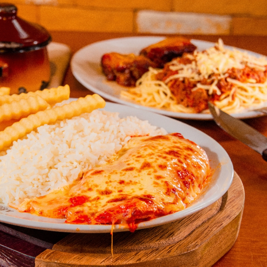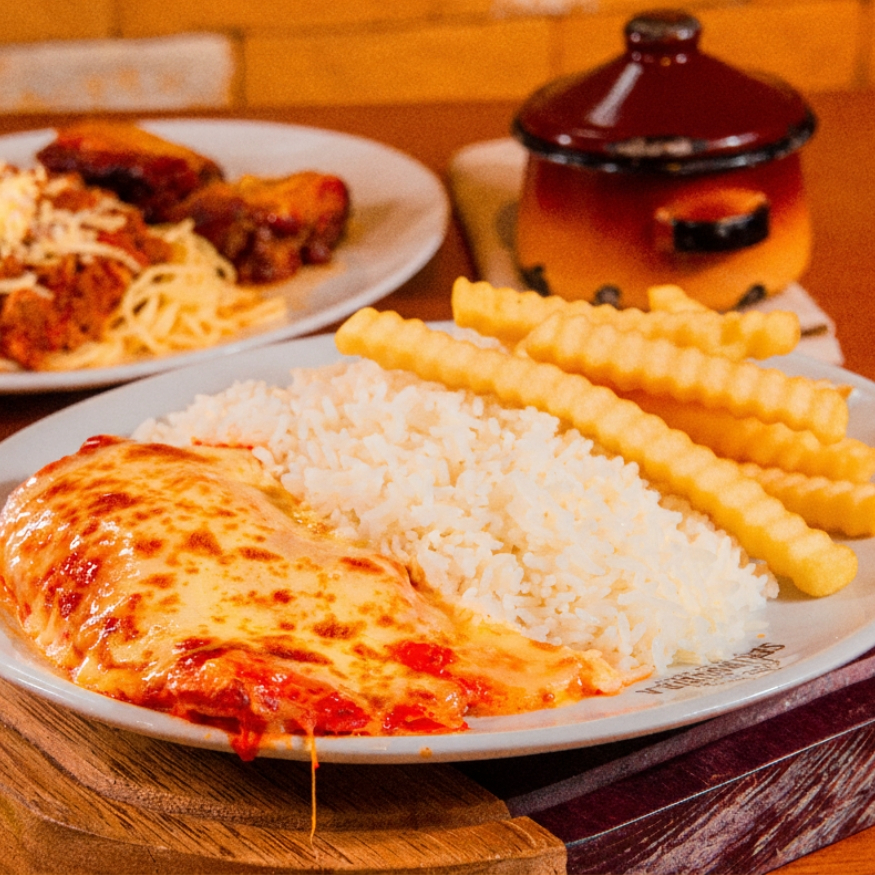 Bife de contrafilé empanado, servido com molho de tomate feito em casa gratinado com mussarela. Acompanha arroz branco e batata frita
