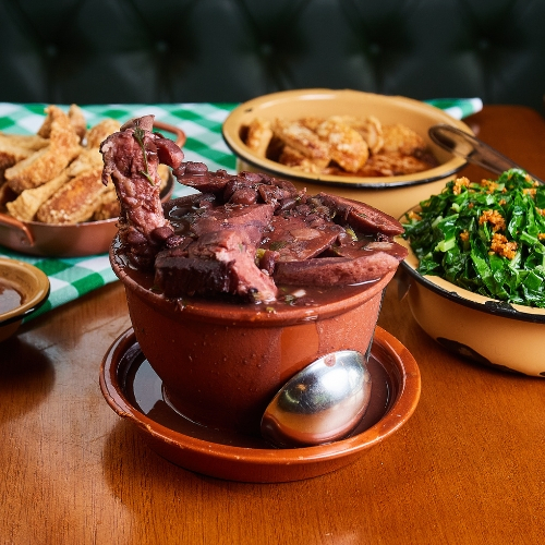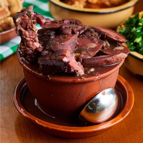 Feijoada preparada com calabresa, paio, carne seca, costelinha suína, pé e rabo suíno.