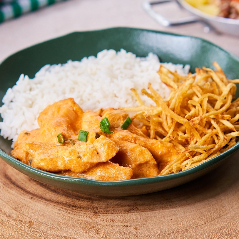 Estrogonofe de frango (sem champignon), servido com arroz e batata palha. Acompanha uma Coca-Cola e uma sobremesa a sua escolha