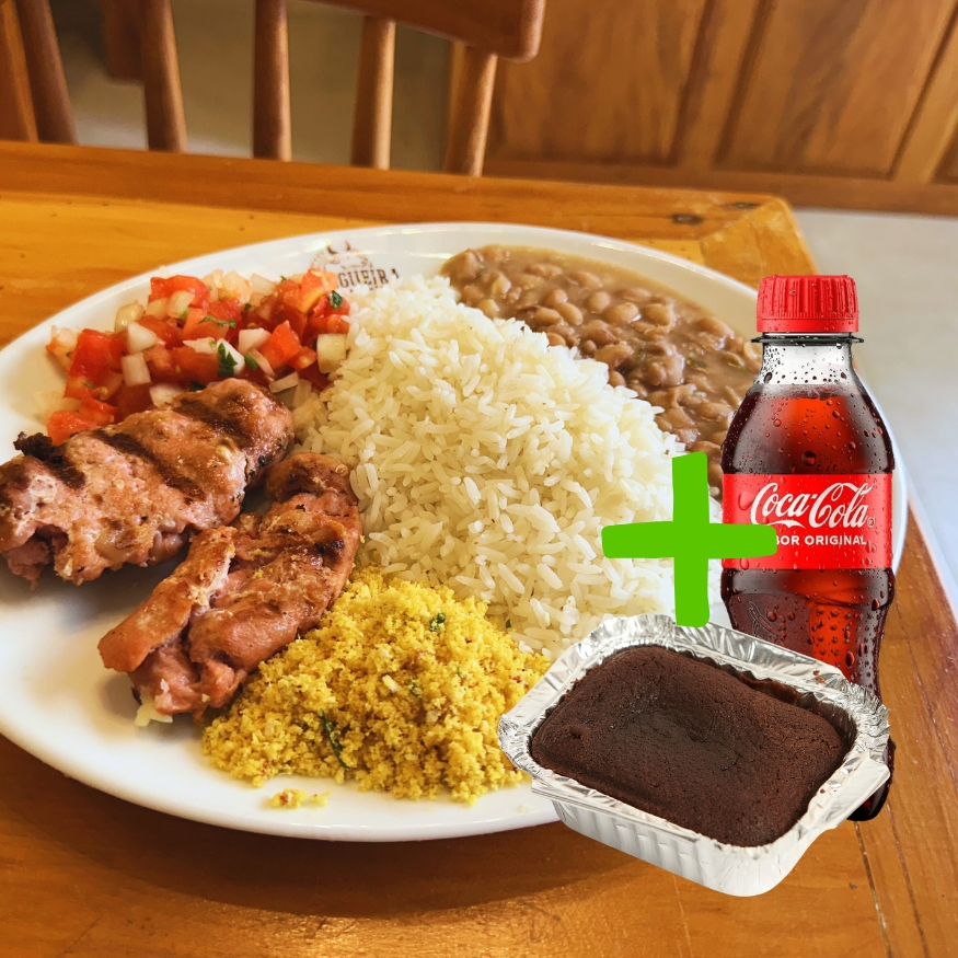 Neste combo você leva um prato de linguiça (arroz, feijão, vinagrete e farofa), uma Coca-Cola e uma sobremesa a sua escolha