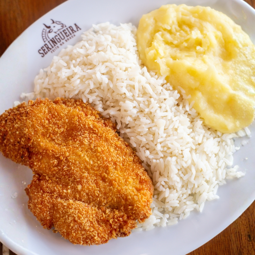 Contrafilé a milanesa servido com arroz, feijão e purê de batata (troque por fritas, se preferir)
