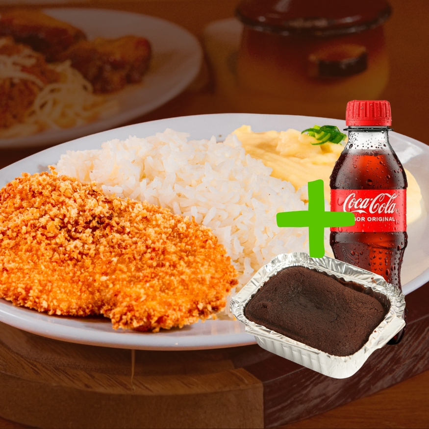 Nesta opção você leva um Frango a Milanesa (arroz, feijão e purê de batata), uma Coca-Coca 200ml e uma deliciosa sobremesa.