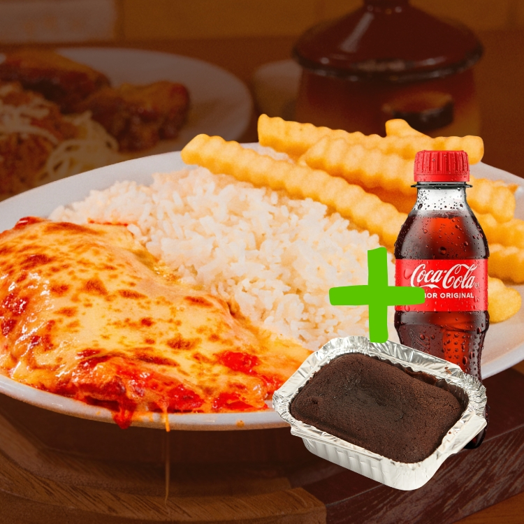 Nesta opção você leva um Parmegiana Frango (arroz e fritas), uma Coca-Cola 200ml e uma deliciosa sobremesa