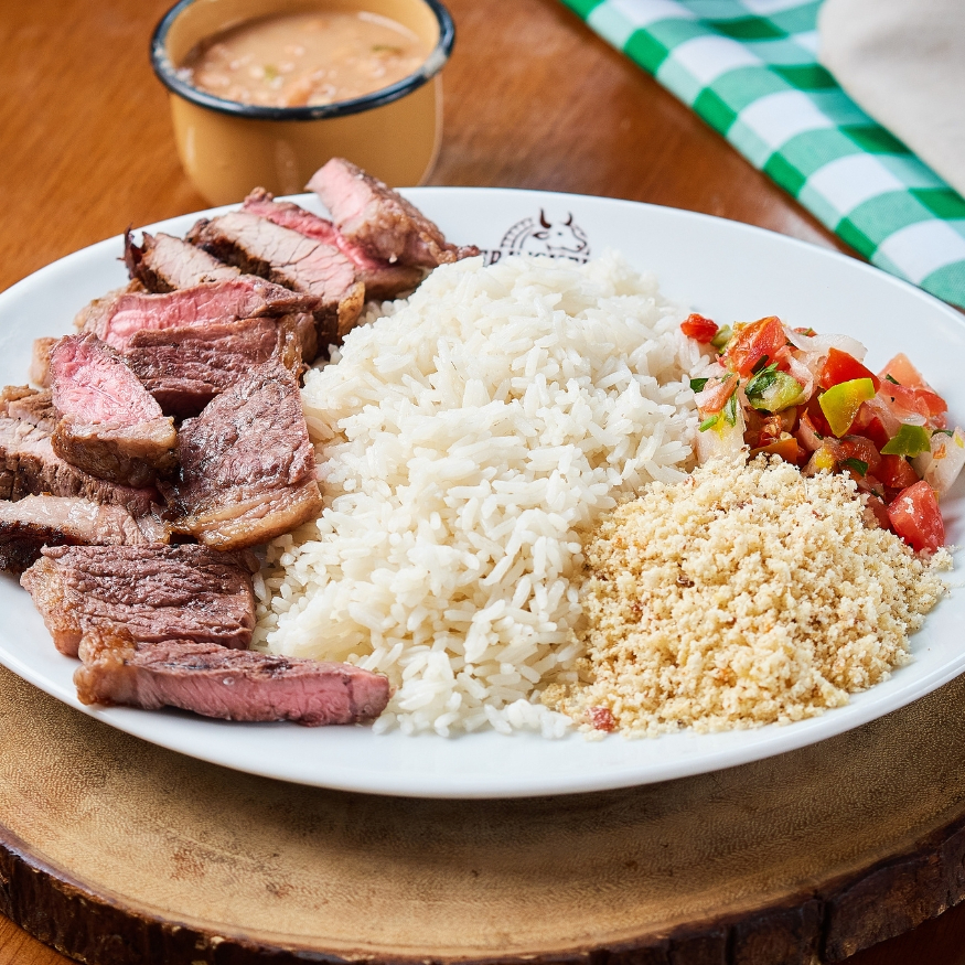 Nosso delicioso baião preparado com arroz, feijão de corda, calabresa, carne seca desfiada, mandioca cremosa e queijo coalho. Nesta opção o Baião é servido com um bife de contrafilé.