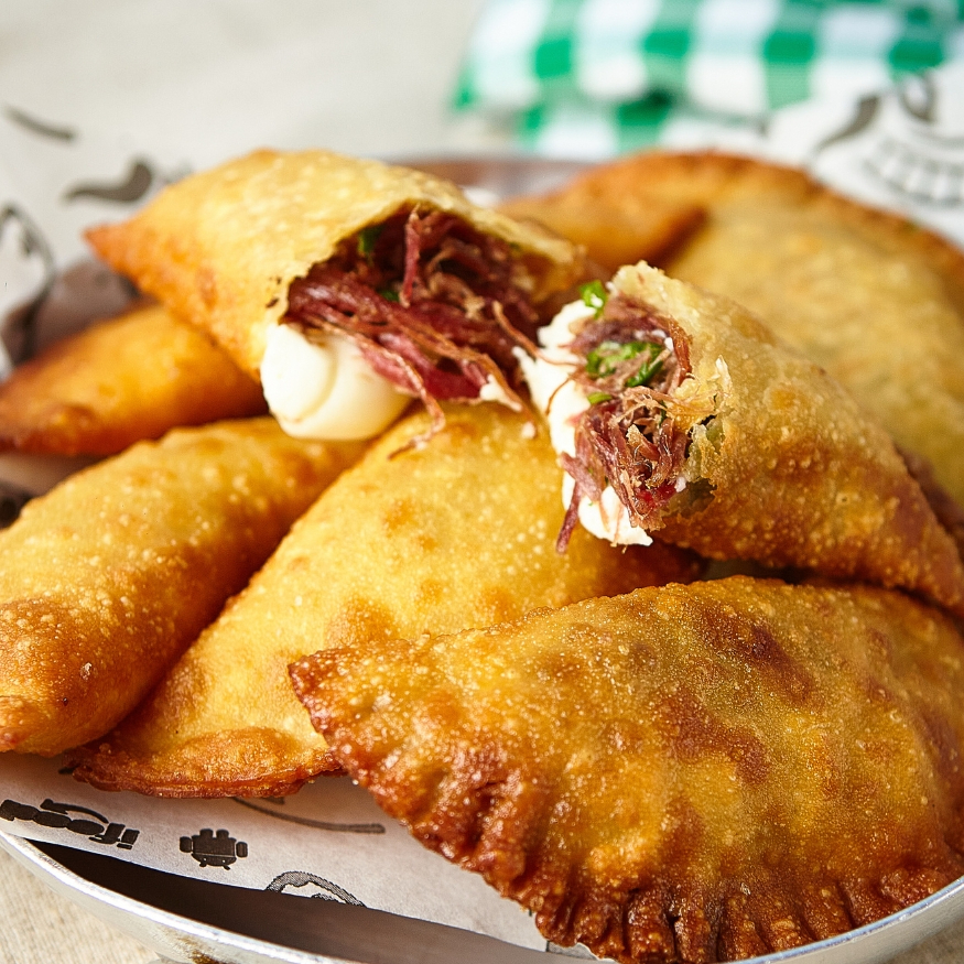 Pastéis divinamente crocante, recheado com a combinação irresistível de carne seca, requeijão cremoso e o sabor único do queijo coalho derretido.