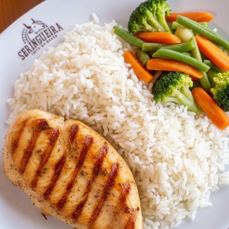 Filé de frango grelhado, servido com arroz, feijão e legumes a vapor.