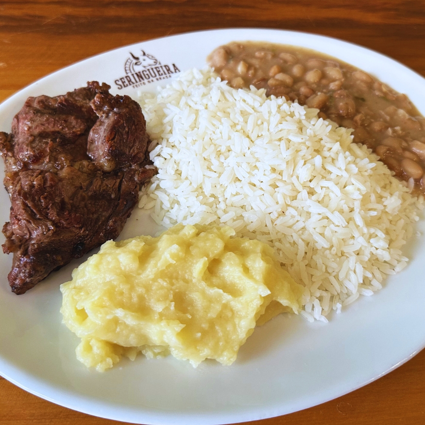 Delicioso contrafilé grelhado na hora, servido com arroz branco, feijão, ovo frito e purê de batata (troque por fritas se preferir)