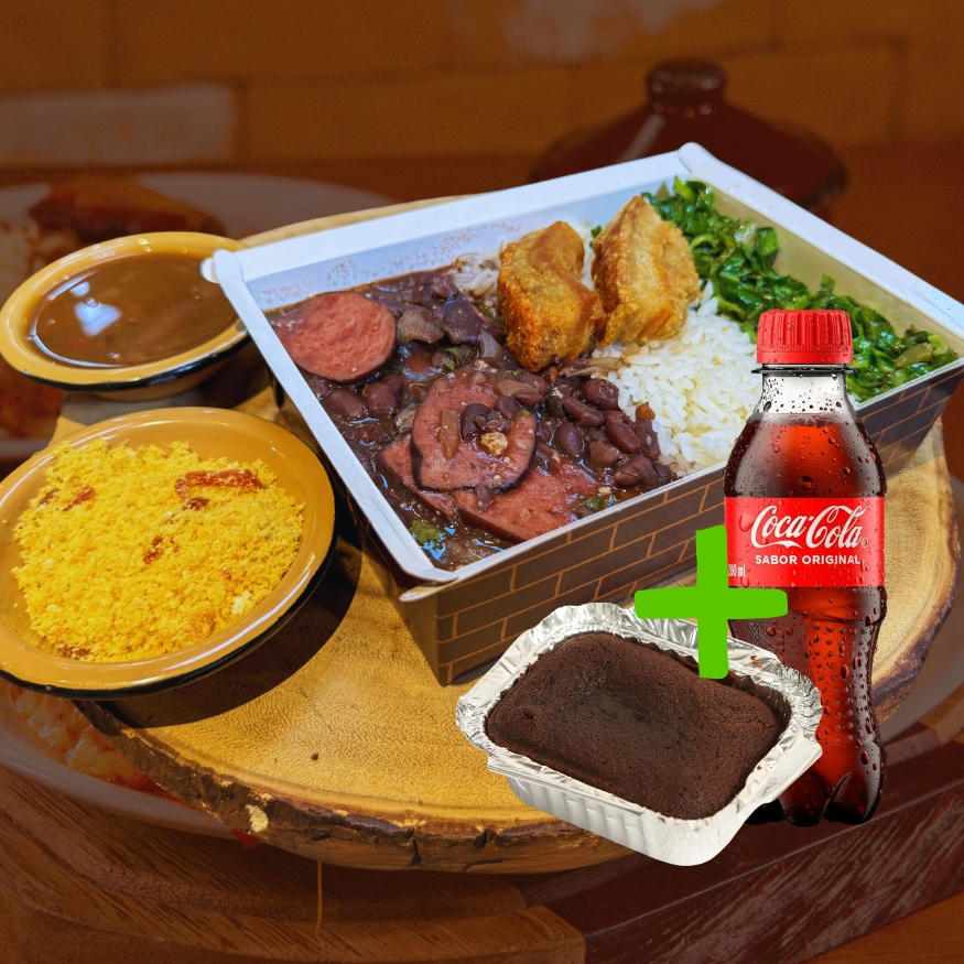 Nesta opção você leva nossa FEIJOADA (paio, calabresa e carne seca) servida com arroz, couve, farofa, molho de pimenta e torresmo + Coca-Cola 200ml + Sobremesa