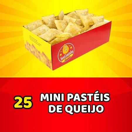 Uma caixa cheia de 25 irresistíveis mini pastéis de queijo : bem recheados, deliciosos, sequinhos e crocantes.