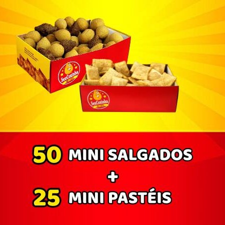 A receita de um combo perfeito : nossos deliciosos salgados + pasteizinhos sequinhos e crocantes! - Uma caixa P de 50 Mini Salgados - Uma caixa P de 25 Mini Pastéis