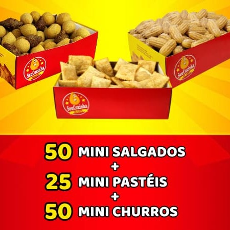 O melhor do Seu Coxinha nesse combo, 3 caixas P dos nossos queridinhos. - Uma caixa P de 50 Mini Salgados - Uma caixa P de 25 Mini Pastéis - Uma caixa P de 50 Mini Churros