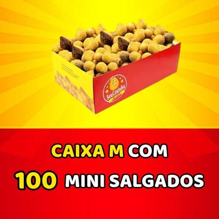 Sabe aquela receita do combo perfeito? Agora é ainda maior! Experimente nossos deliciosos salgados + pasteizinhos sequinhos e crocantes! - Uma caixa M de 100 Mini Salgados - Uma caixa M de 50 Mini Pastéis