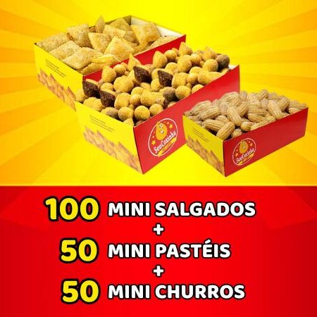 Caixas maiores para ainda mais sabor do melhor do Seu Coxinha! - Uma caixa M de 100 Mini Salgados - Uma caixa M de 50 Mini Pastéis - Uma caixa P de 50 Mini Churros