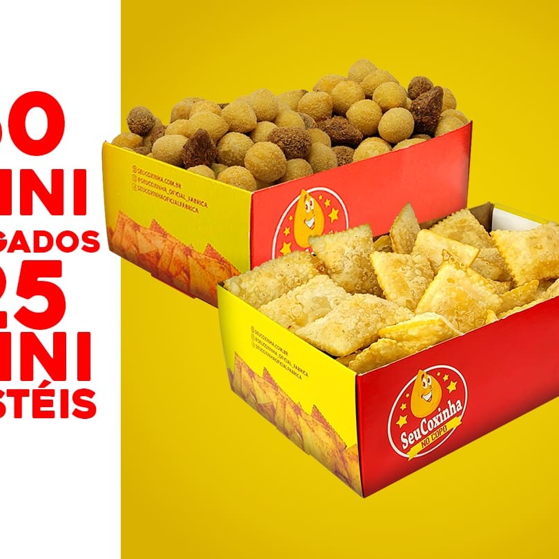 O melhor do Seu Coxinha nesse combo, nossos queridinhos. - 50 mini salgados + 25 mini churros + 25 mini pastéis