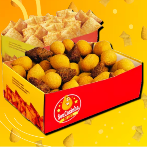 1 Caixa com 100 Mini-salgados (9g) e 1 Caixa com 25 Mini-Pastéis (10g)!