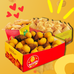1 Caixa com 100 Mini-Salgados (9g); 1 Copo com 12 Mini-Pastéis (10g) e 1 Copo com 13 Mini-Churros (9g)!