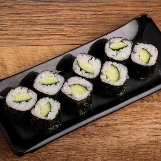 Pepino, arroz japonês e alga.
