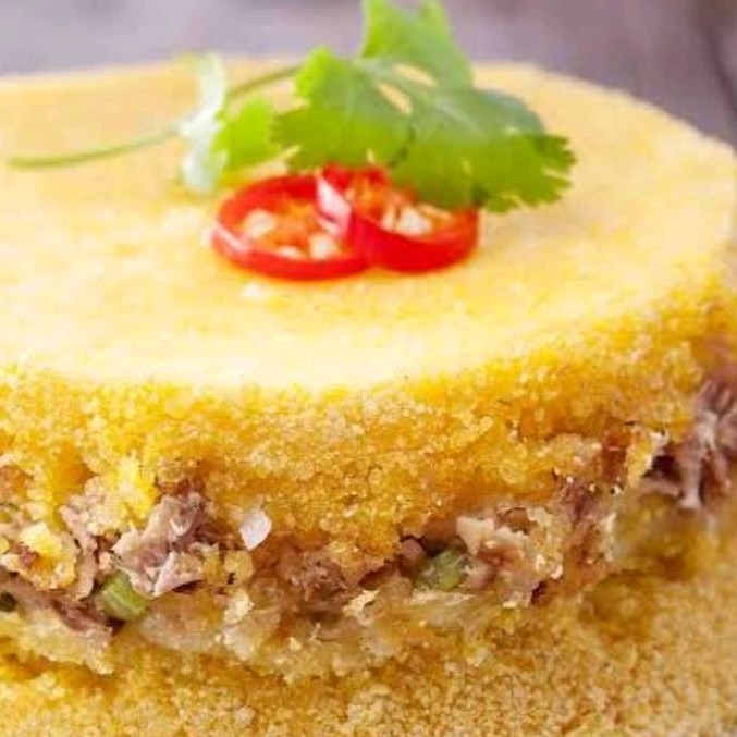Ele é feito cuscuz acompanha de frango cozinhado ao molho , o verdadeiro cuscuz nordestino .....