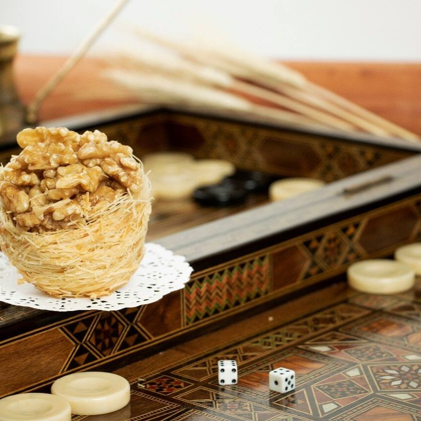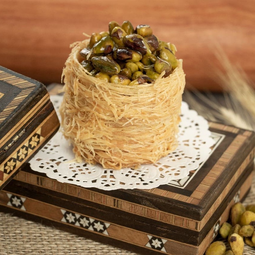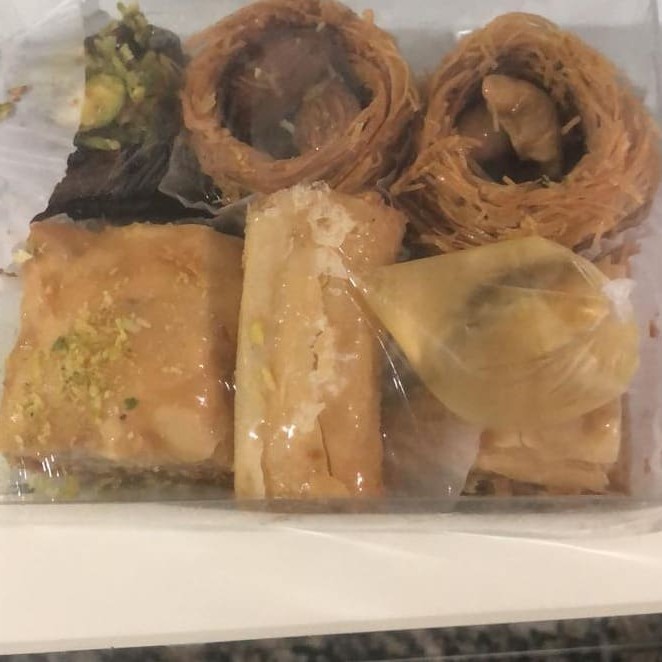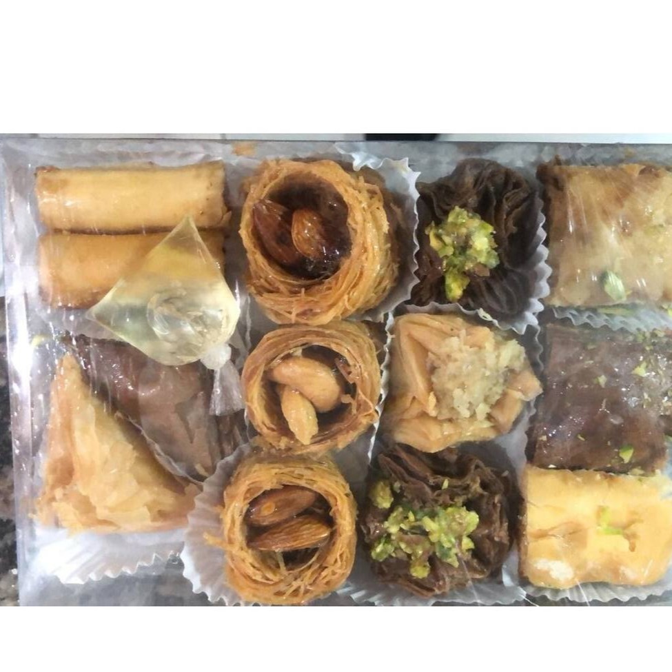 Ela vem com 13 doces árabes, 4 de pistache,6 de nozes, 1 de caju, 2 de amêndoas