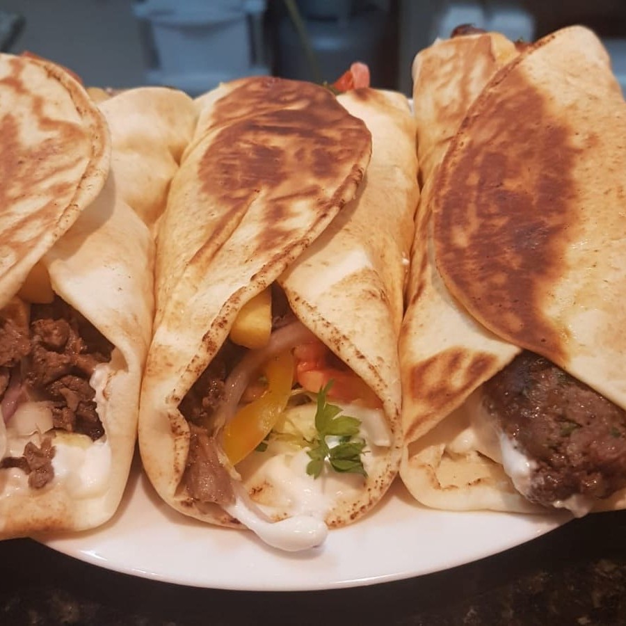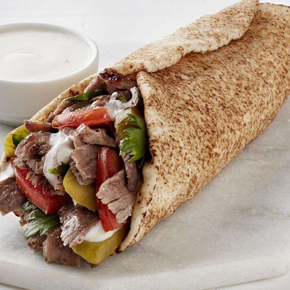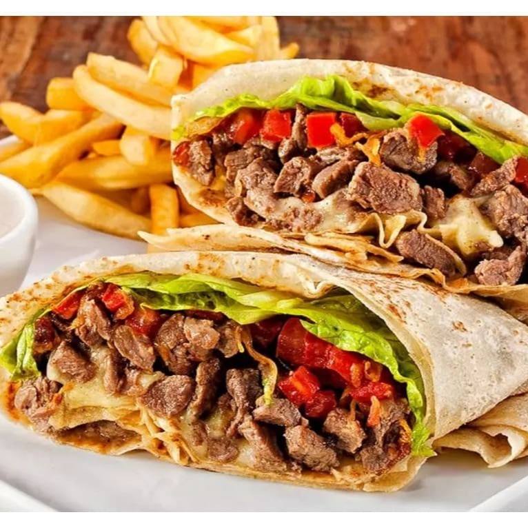 Pão Sírio, tiras de carne bovino, pasta de alho, molho de tahine, tomate, picles, salsinha, batata frita, cebola, acelga crespa, assado na chapa