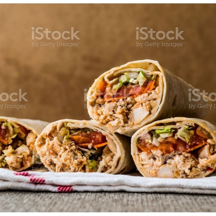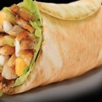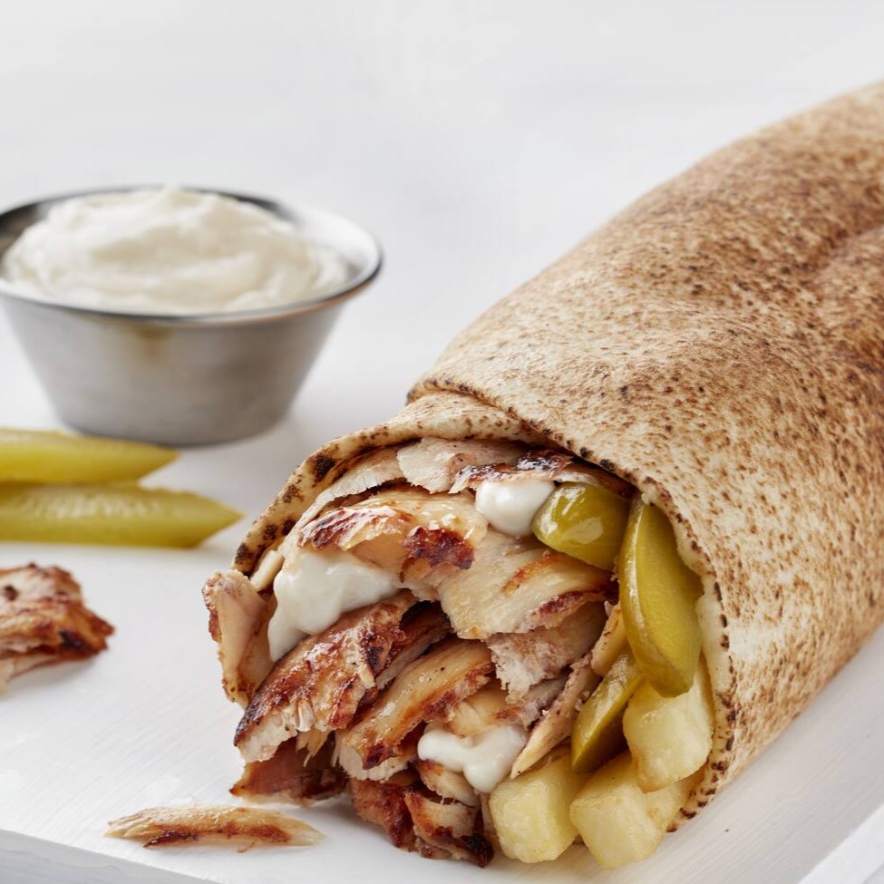 Pão Sírio, tiras de carne e frango, tahine, pasta de alho, salsinha, acelga crespa, tomate, picles, cebola, batata frita dentro lanche, assado na chapa