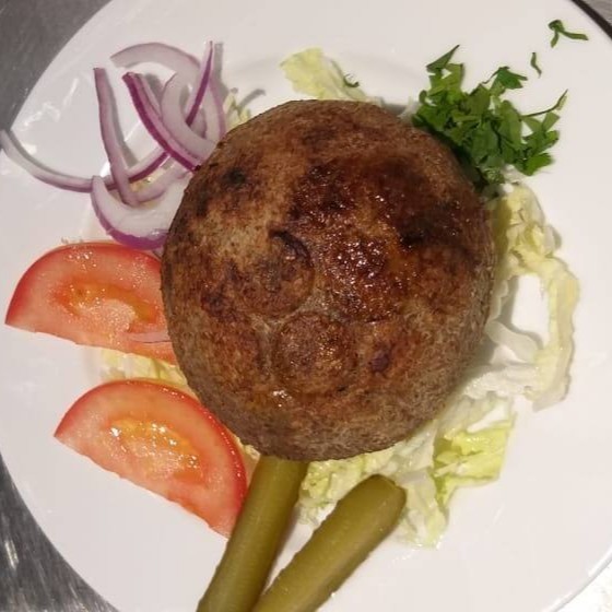 2 espeto de kafta carne bovina, Pão Sírio, pasta de alho, molho de tahine, tomate, picles, salsinha, acelga crespa, batata frita, cebola roxa.