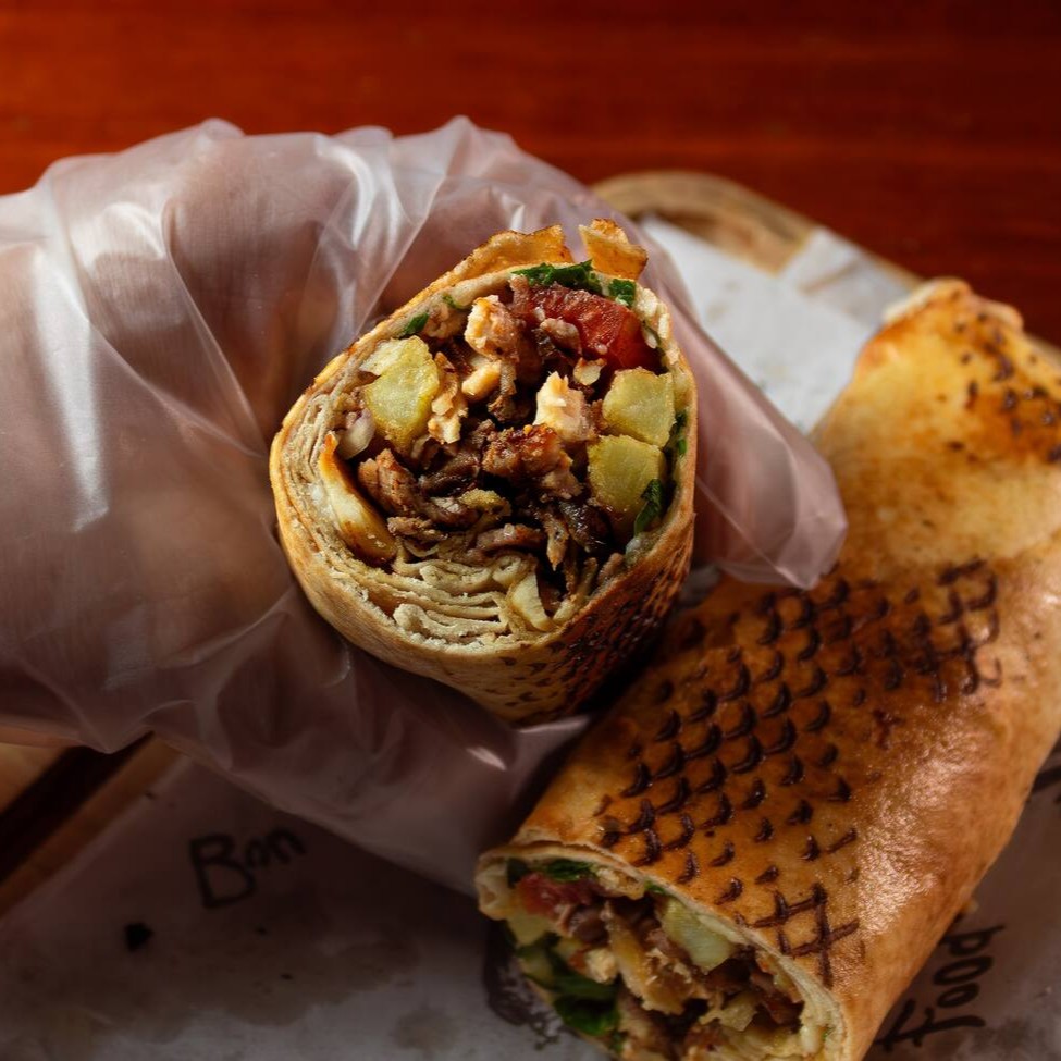 Pasta de homos, salsinha, cebola, picles, tomate, batata frita.