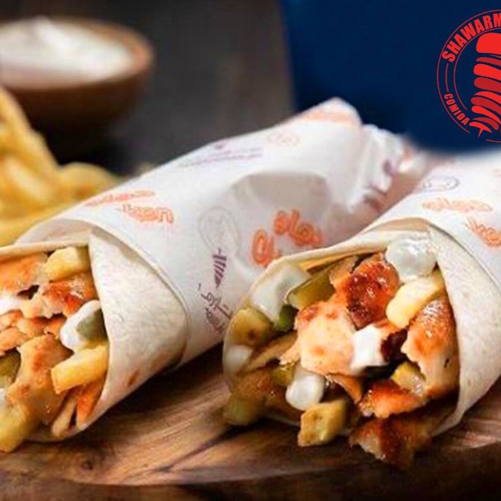 Frango e carne, pasta de alho, salsinha cebola, tomate, picles e batata frita