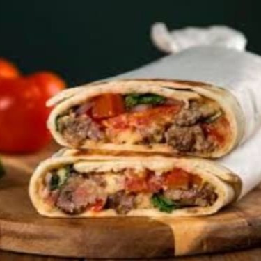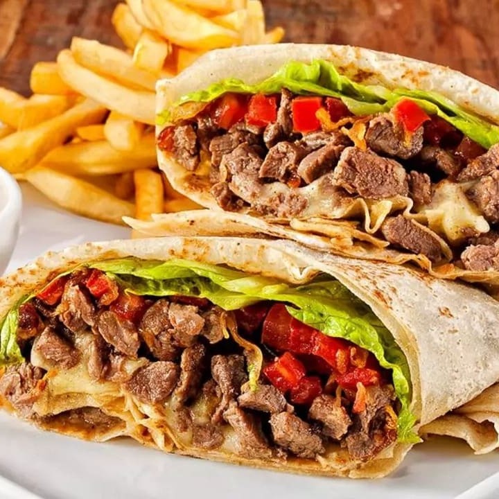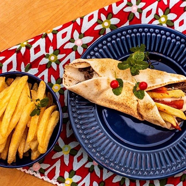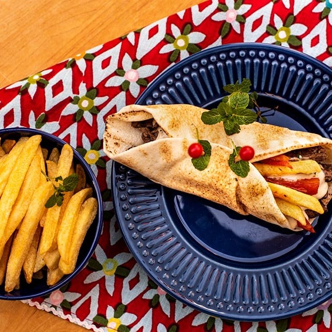 Pão Sírio, tiras de carne bovino, pasta de alho, molho de tahine, tomate, picles, salsinha, batata frita, cebola roxa, assado na chapa