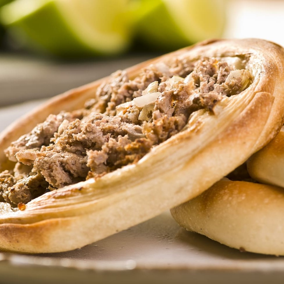 Esfiha aberta de carne. Tempero típico árabe com pimenta síria. Assada na hora na perfeição. Utilizamos os melhores ingredientes nesta receita