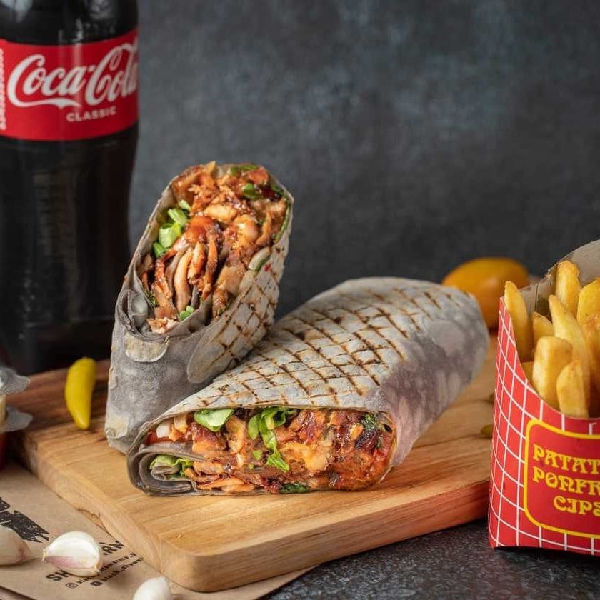 Pão Sírio, frango, pasta de alho, molho de tahine, tomate, picles, salsinha, batata frita, cebola roxa.