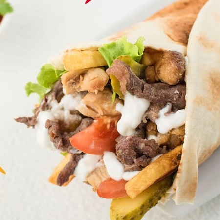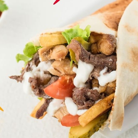 Misto de carne e frango em pão árabe com pasta de alho, tomate, alface, cebola e fritas.
