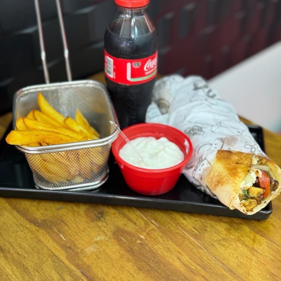 1 kebab misto, 1 porção de batatas fritas, 1 refrigerante 200ml e molhos.