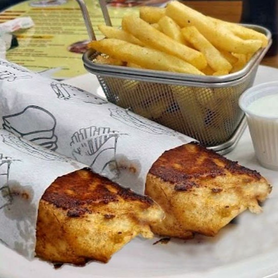 Carne bovina em pão árabe com pasta de alho, tomate, alface e fritas.