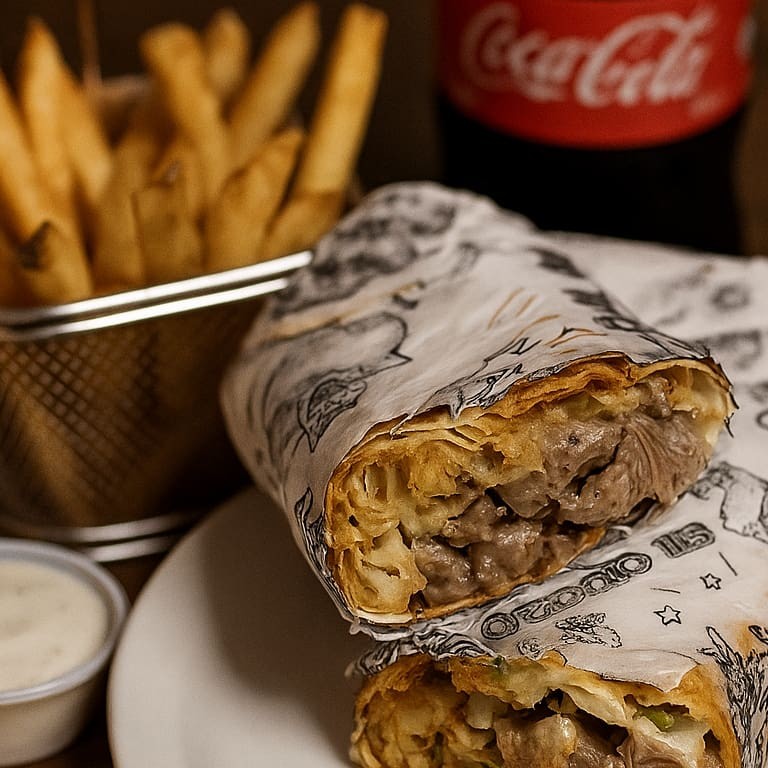 Carne bovino temperado e assado, acompanhado de pão árabe, pasta de alho e batata frita, tomate e alface. 1 porção de batata frita 1 pasta de alho 1 refrigerante 200ml