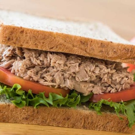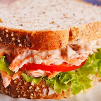 Sanduíche de patê de atum, feito no pão de forma integral, com maionese, salada de alface tomate e cenoura ralada.