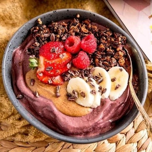 Áçaí natural no pote de 700ml com 1 fruta e 2 acompanhamentos.