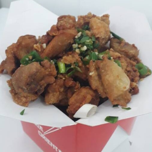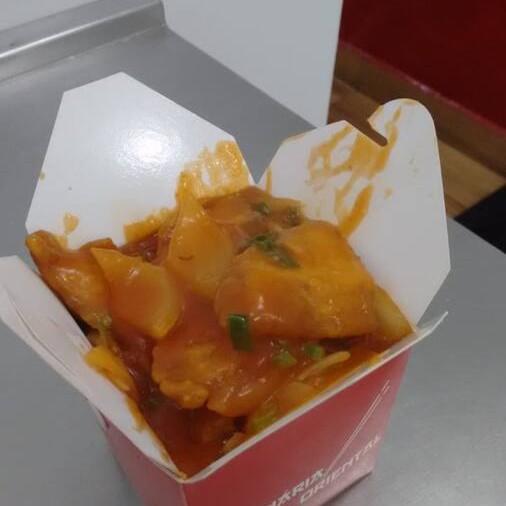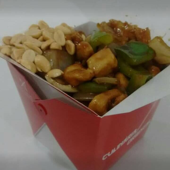 Cubos de peito de frango, cebola, pimentão, temperado ao molho de soja.