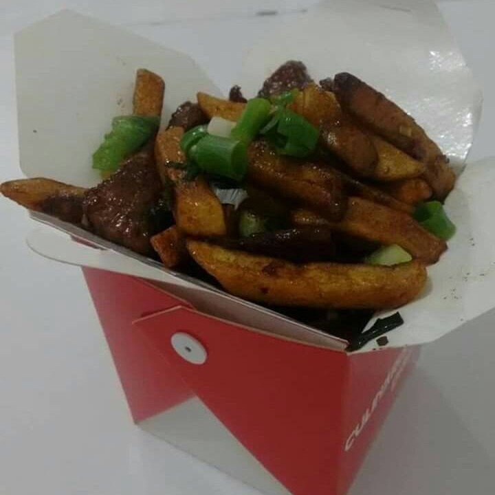 Fatia de carne, batata frita, temperada com cebolinha e alho ao molho shoyu