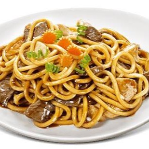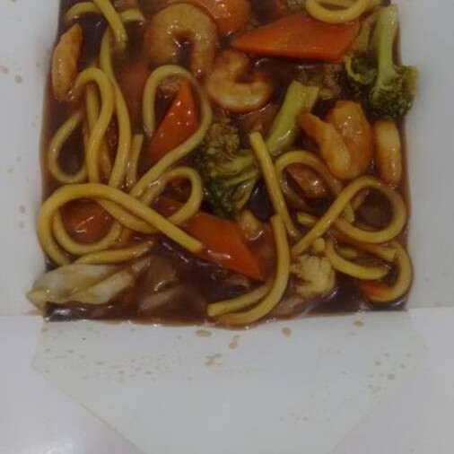Macarrão com saborosos pedaços de frango e fatias de carnê e camarão,legumes selecionadas e temperado ao molho de soja.