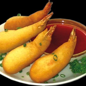 Camarão empanado e sequinho, acompanha molho agridoce.