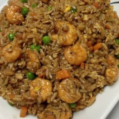 Arroz,ervilha,cebola, cenoura,floco de ovo,camarão ao molha shoyu