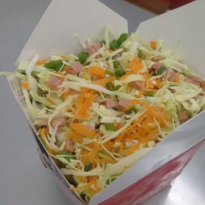 Repolho desfiado, cenoura, presunto, queijo e cebolinha.