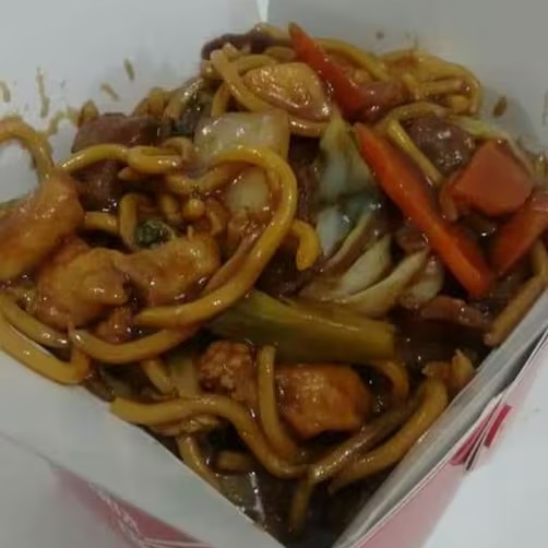 Macarrão com saborosos pedaços de frango e fatias de carne, legumes selecionados e temperado ao molho de soja.