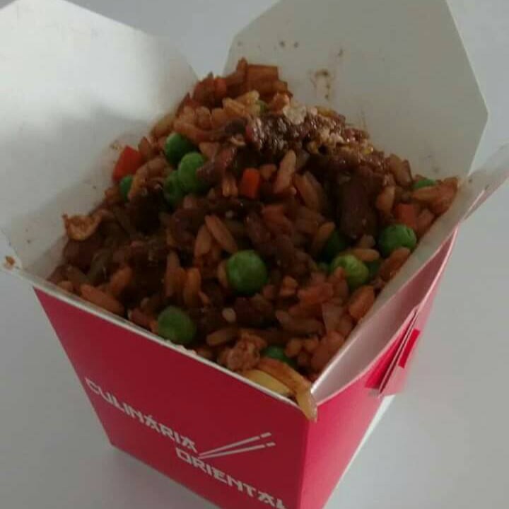 Risoto com carne bovina em tiras, cenoura, ervilha e flocos de ovos temperados com cebola picada e molho de soja.