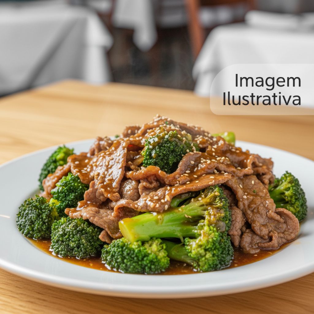 Fatias suculentas de carne bovina salteadas com brócolis frescos em um molho de soja levemente adocicado.