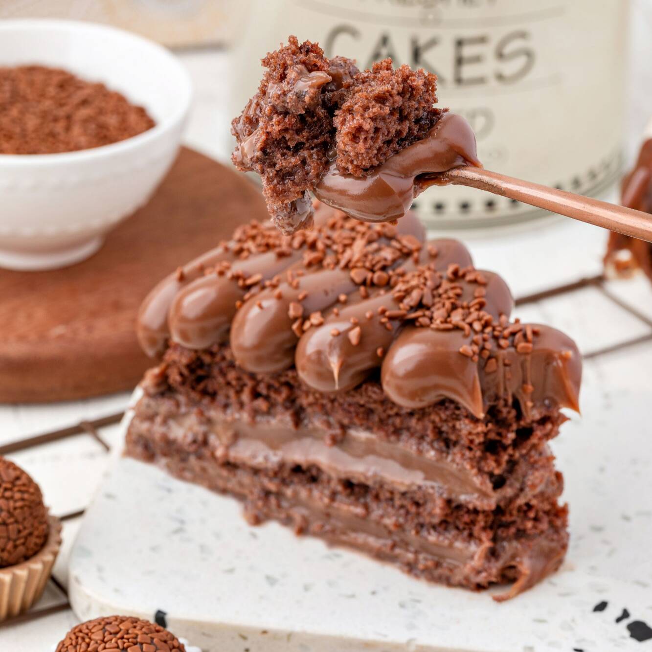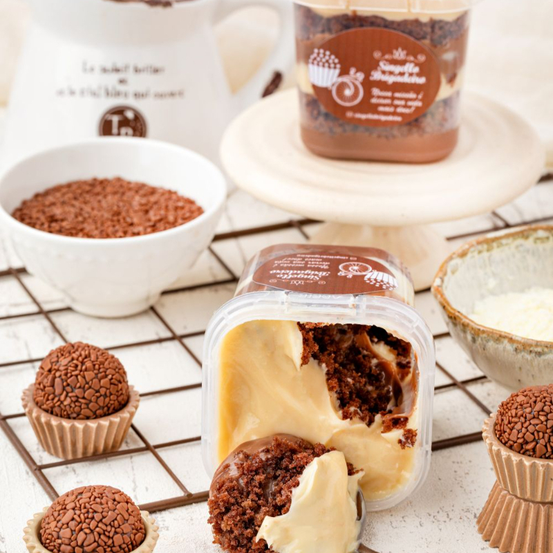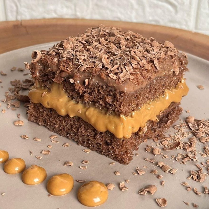Duas camadas de Bolo de Chocolate, com duas camadas de Brigadeiro de chocolate cremoso, uma camada de Brigadeiro de Leite Ninho finalizado com uma cobertura de Brigadeiro de Leite Ninho. Aprox. 250g