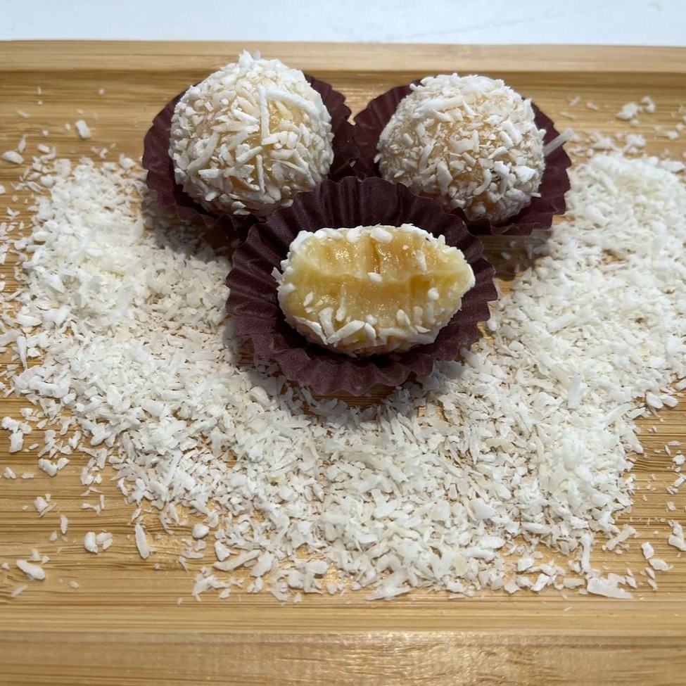Delicioso brigadeiro de coco, finalizado com coco ralado. Aprox. 18g